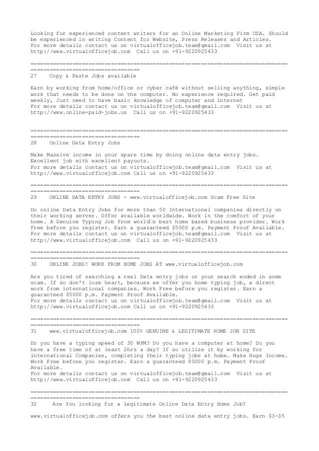 Free copy and paste data entry job. How to avoid online data entry scams. See all remote jobs >. Micro jobs are processing simple tasks by following instructions that take few seconds to. Positions for work from home data entry jobs are readily available throughout the web.